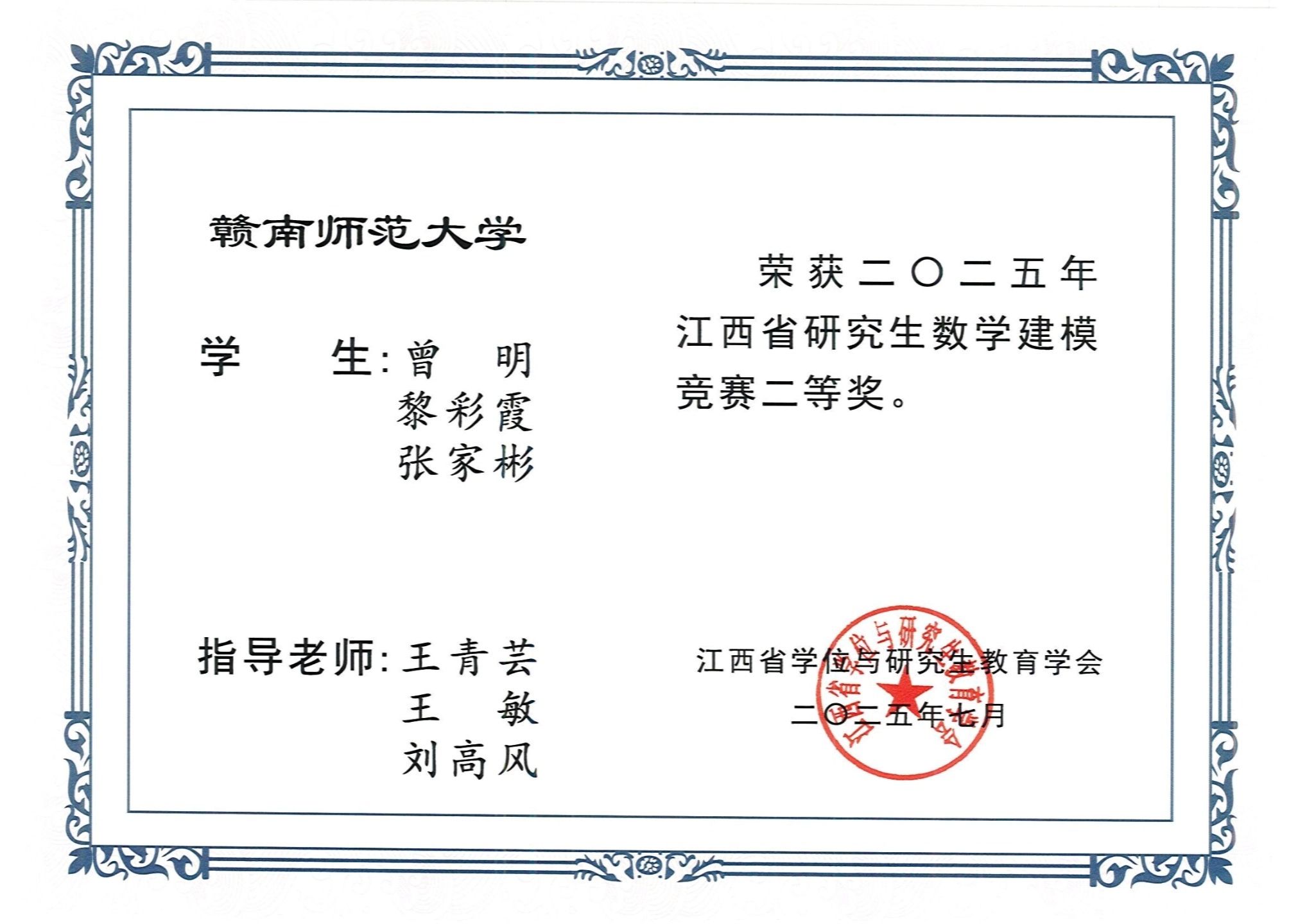 此外,曾明同学荣获研究生国家奖学金、江西省一等学业奖学金等多项奖项,分别获得2023-2024年度和2024-2025年度赣南师范大学“三好学生”荣誉称号、分别获得赣南师范大学2023年度和2024年度“优秀共青团员”荣誉称号,在学业、科研、竞赛多个领域全面开花。他注重个人成长,始终以高标准要求自己,在学习与实践中不断追求突破,努力去遇见一个更好的自己。