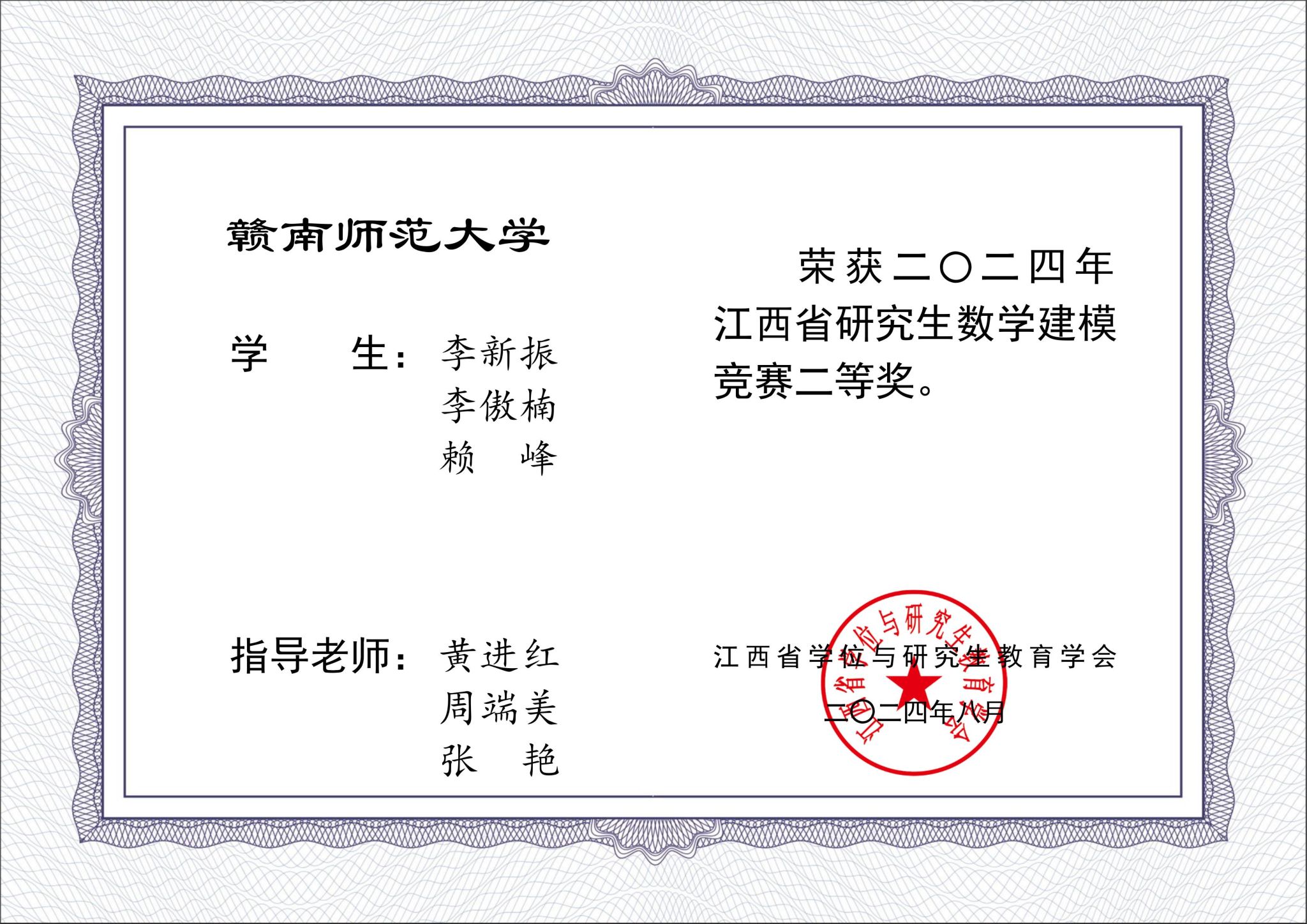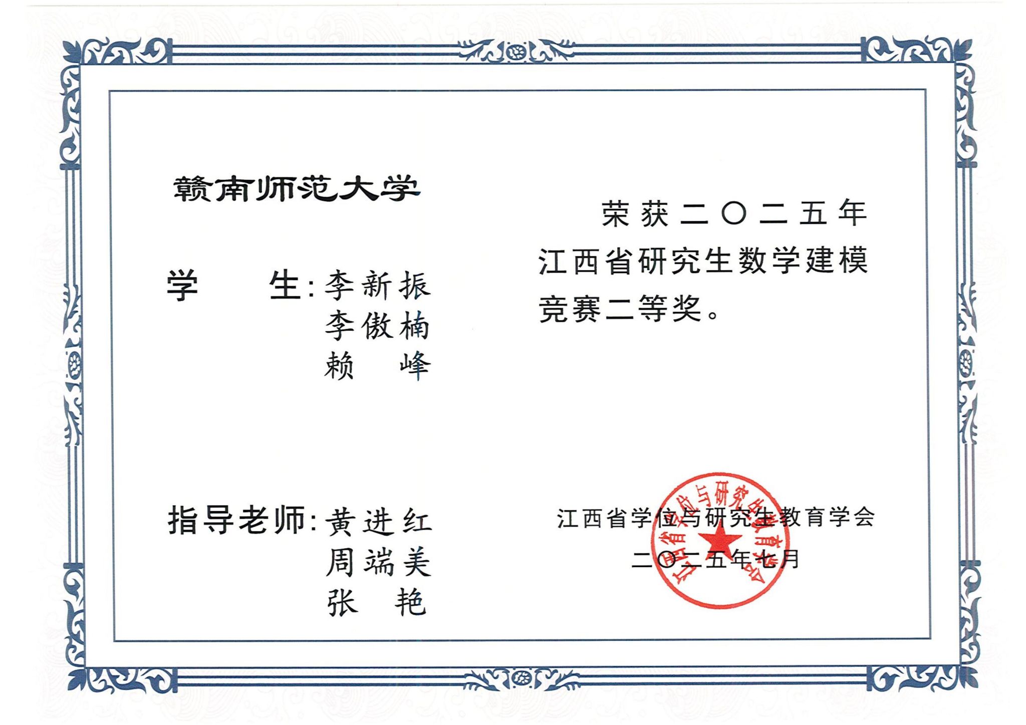 在竞赛实践领域,李新振同学屡获佳绩:先后斩获2024年江西省创新创业大赛省级银奖,2024年、2025年江西省研究生数学建模竞赛二等奖等奖项。一系列竞赛历练不仅助推他的实践能力持续进阶,更让他在创新思维与团队协作方面积累了丰富经验,实现了从参赛学习者到核心引领者的完美蜕变,如今已成为竞赛团队中不可或缺的中坚力量。
