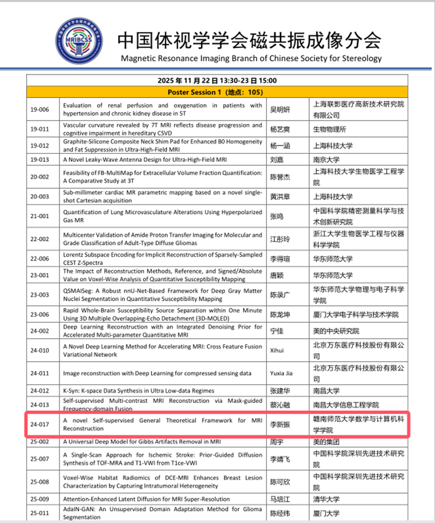 学术交流方面,他多次参与国内重要学术会议,并凭借相关研究成果,受邀在“2025中国体视学学会磁共振成像分会年会暨第二届诺丁汉高级磁共振成像论坛”作Poster报告,其研究工作获得了领域内同行的关注与认可。