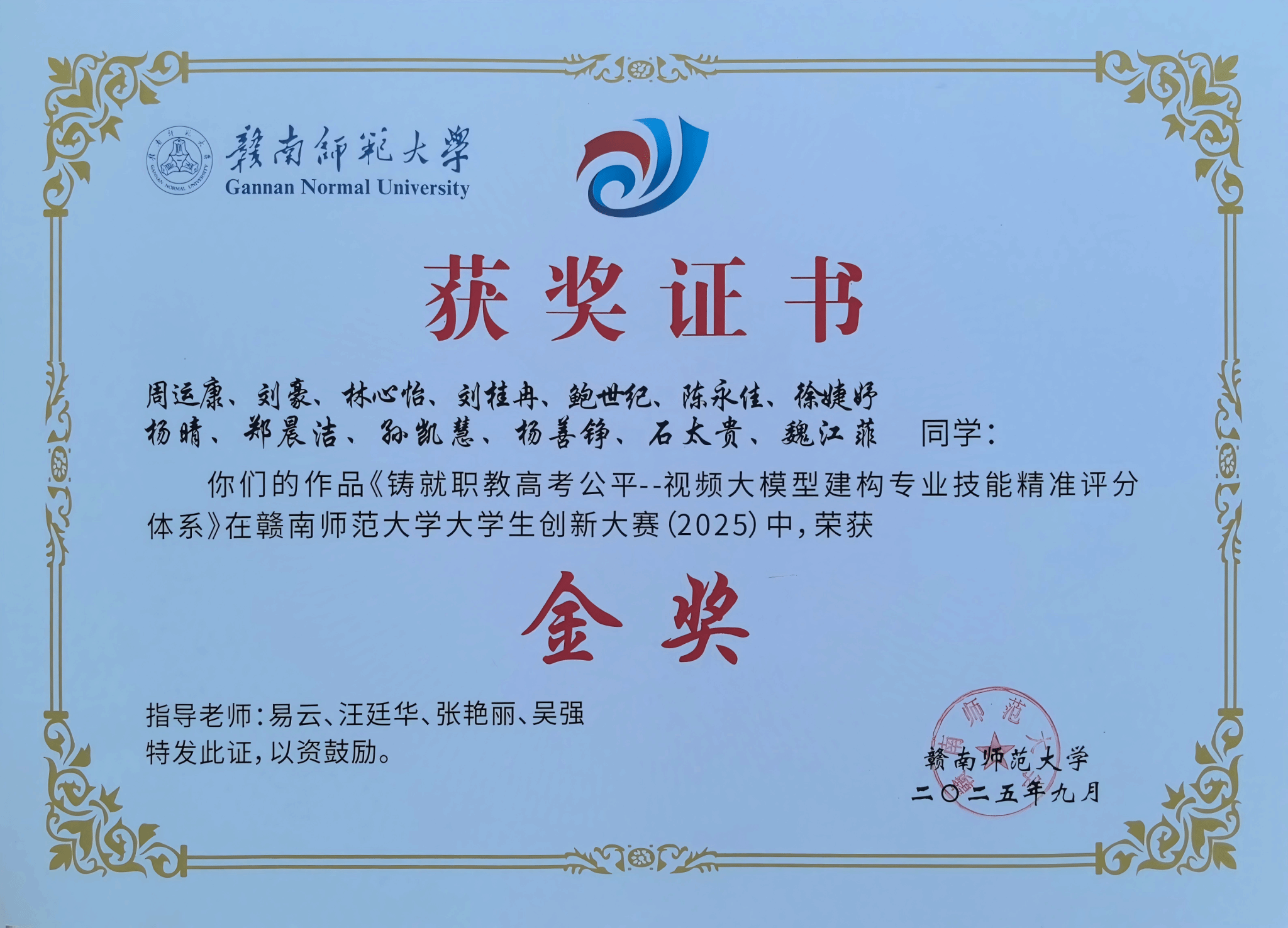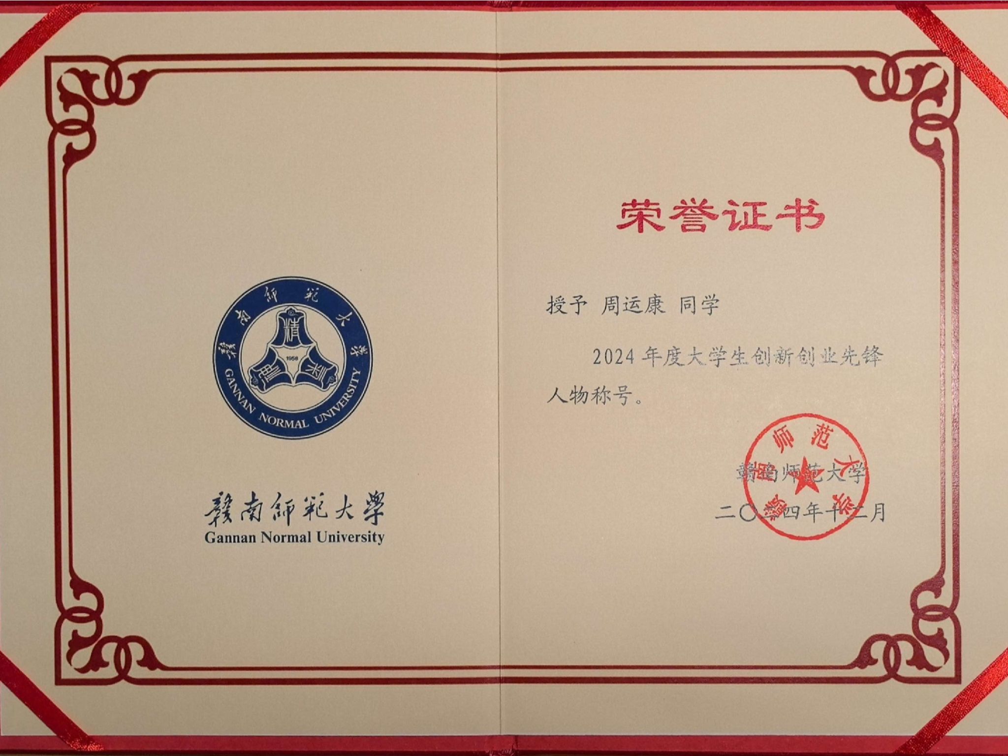 周运康同学积极投身各类创新创业与科研竞赛,勇于实践、勤于钻研,展现出扎实的专业功底与出色的创新能力,先后在中国国际大学生创新大赛中荣获铜奖;在“建行杯”江西省大学生创新大赛中斩获省级金奖;在江西省第十四届“挑战杯”大学生创业计划竞赛中获省银奖;在江西省研究生数学建模竞赛中荣获二等奖;并于2025年赣南师范大学大学生创新大赛中再获金奖。这些成绩不仅体现了他扎实的学术素养与团队协作精神,也展现了他将科研理论与创新实践紧密结合的能力与风采。
