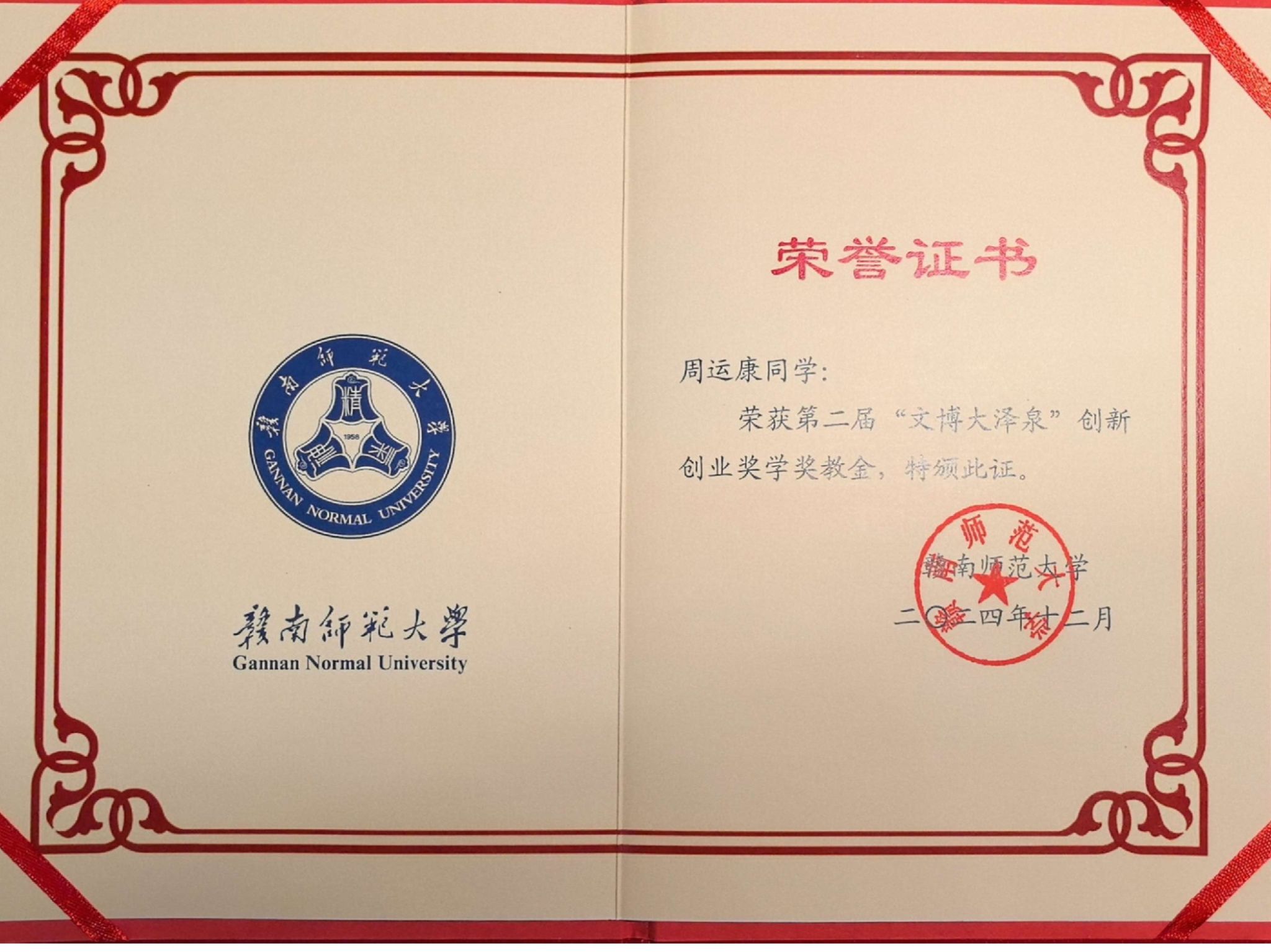 在校期间,周运康同学荣获研究生国家奖学金、江西省一等奖学业奖学金以及“文博大泽泉”创新创业奖学奖教金等多项荣誉。未来,他将继续在人工智能与深度学习领域深耕,积极投身科研创新与社会实践,用所学专业知识服务社会、助力发展,在实践中书写属于自己的青春答卷。