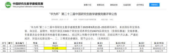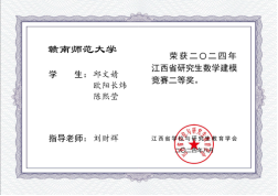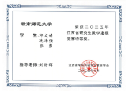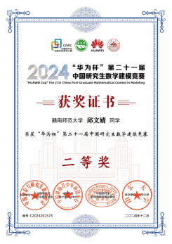 邱文婧同学积极参加各类高水平学科竞赛,屡获佳绩,荣获“华为杯”中国研究生数学建模竞赛二等奖等5项国家级奖项,以及“建行杯”中国创新创业大赛江西省赛银奖、江西省研究生数学建模竞赛特等奖等6项省级奖项。作为团队队长和项目负责人,她善于统筹协调、凝聚共识,在多类比赛中展现出优秀的组织能力和团队精神。