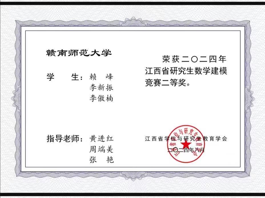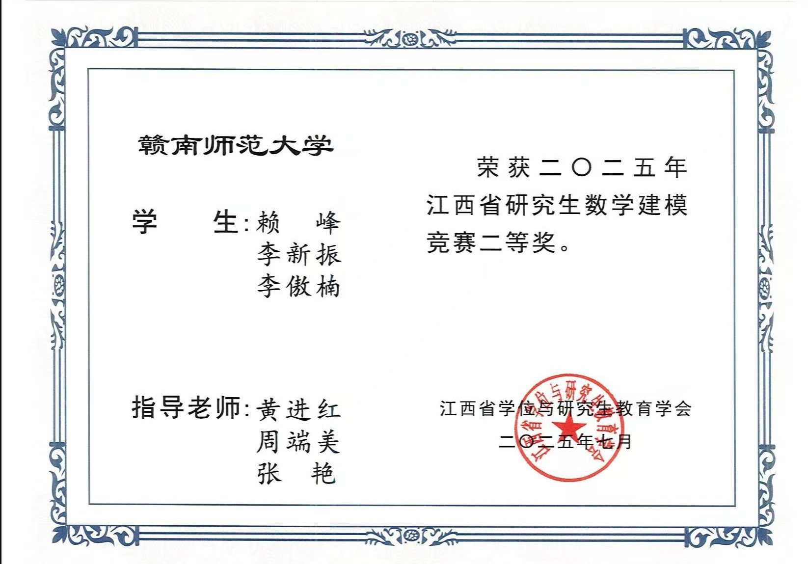 赖峰同学始终秉持精益求精的治学态度,积极投身于各类专业竞赛,将理论知识转化为实践能力,展现出较高的专业素养与创新能力。他积极参加各类学科竞赛,在2024年、2025年江西省研究生数学建模竞赛中均获得二等奖,展现了其在该领域扎实的理论功底。